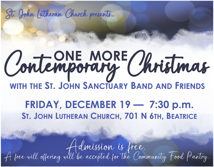 - Worship & Music: Worship in the Park was a wonderful day - thank you everyone for your help! Will start looking towards the holidays with the Contemporary Christmas Concert being scheduled for December 19th at 7 PM. Christmas tree setup is scheduled for November 29th.